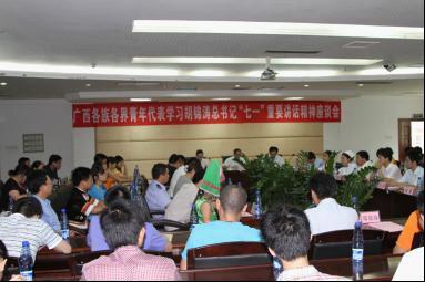 7月2日下午,共青團廣西區(qū)委、廣西青年聯(lián)合會、廣西學生聯(lián)合會和廣西區(qū)少工委在南寧召開座談會,認真學習領會胡錦濤總書記在慶祝中國共產(chǎn)黨成立90周年大會上的重要講話精神,并圍繞進一步為黨做好新形勢下的青年群眾工作進行了交流討論。