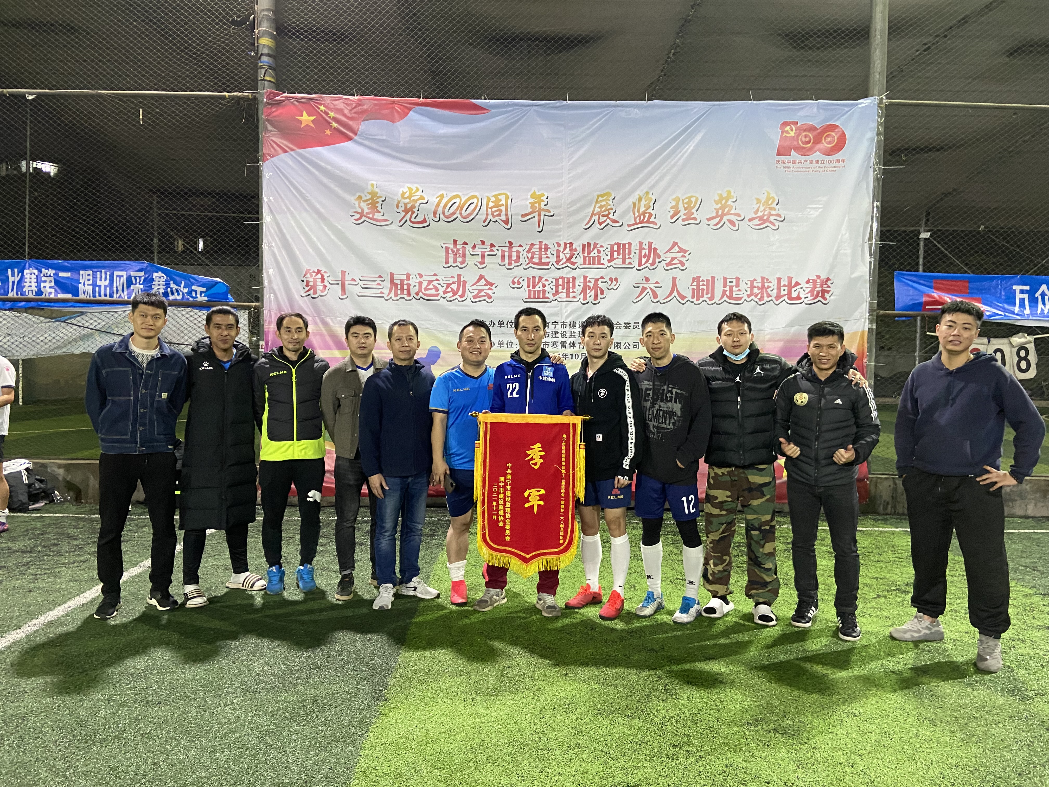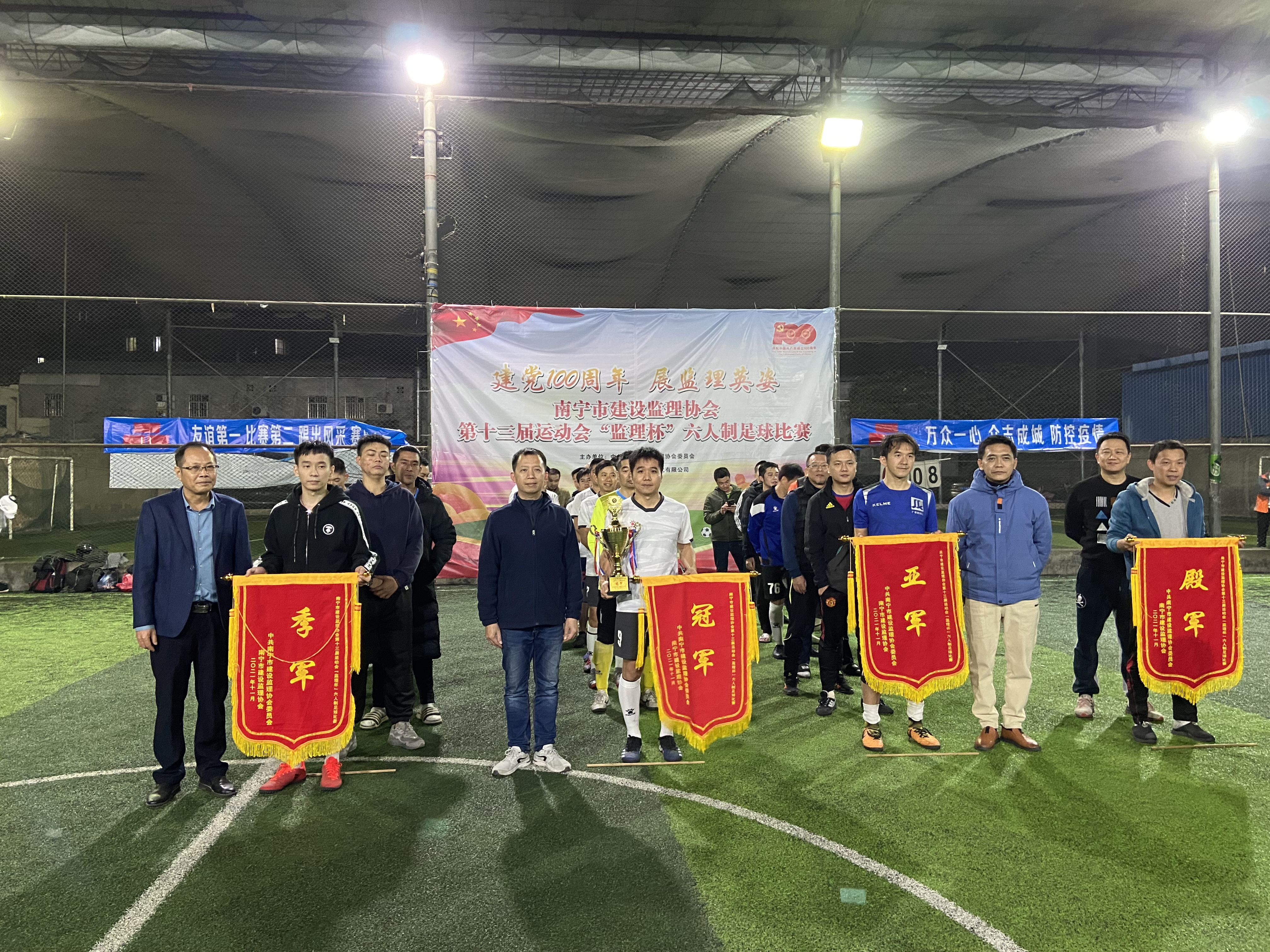 為慶祝中國共產(chǎn)黨建黨100周年,中共南寧市建設(shè)監(jiān)理協(xié)會委員會和南寧市建設(shè)監(jiān)理協(xié)會共同舉辦了南寧市建設(shè)監(jiān)理協(xié)會第十三屆運動會“監(jiān)理杯”六人制足球比賽,經(jīng)過兩個多月緊張、激烈的比賽,于2021年12月23日23:00完美落幕,南寧品正足球隊在此次比賽中榮獲季軍。
