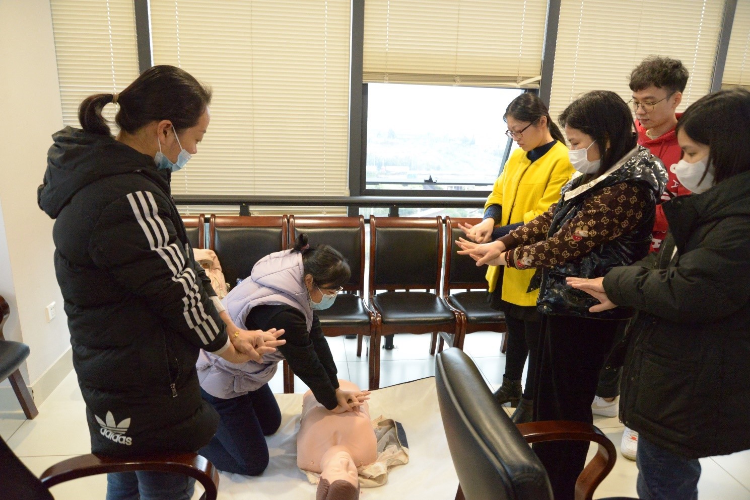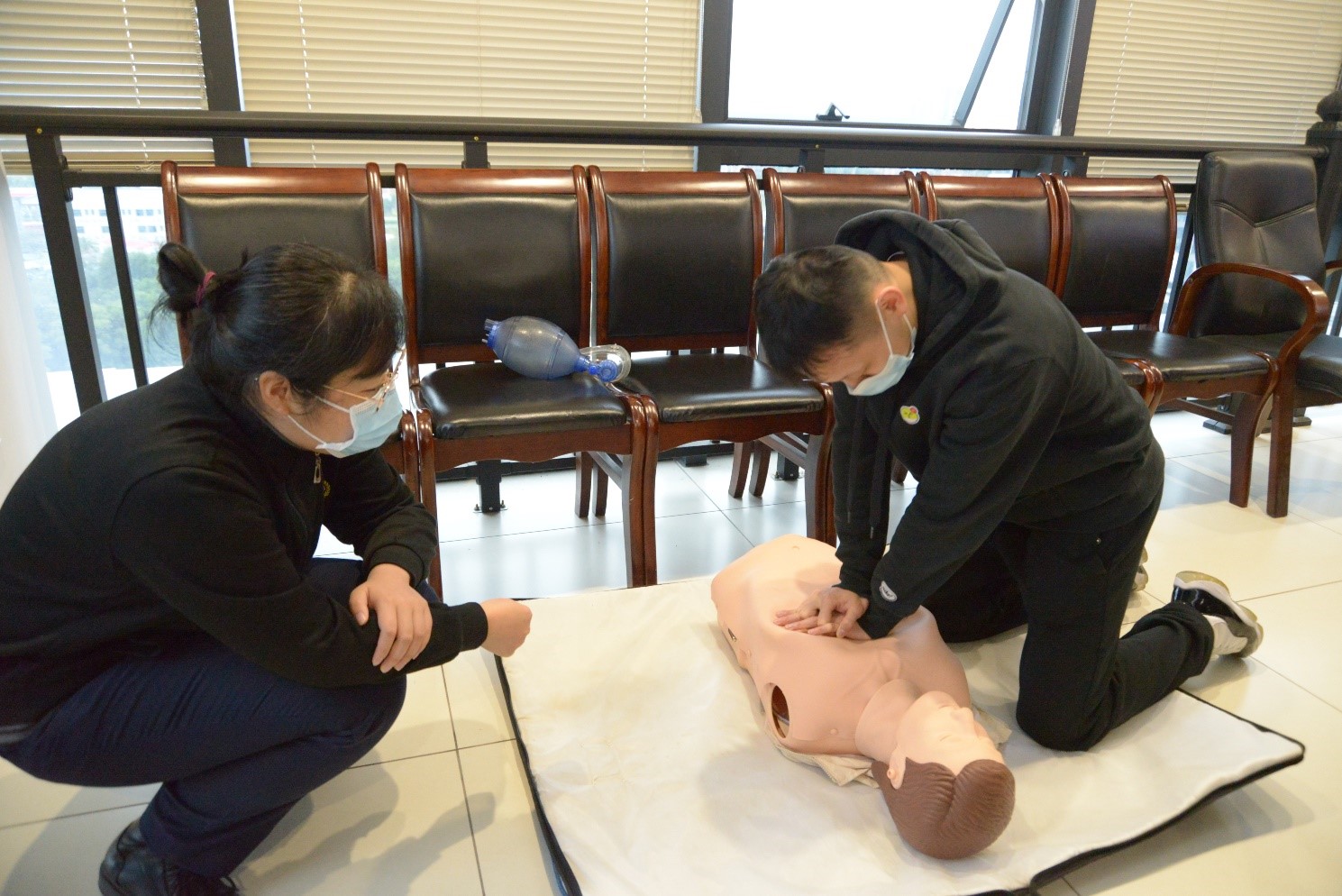 授課現(xiàn)場,培訓(xùn)老師緊扣應(yīng)急救護(hù)重點(diǎn),闡述了心肺復(fù)蘇(CPR)的理論知識(shí)和重要性,系統(tǒng)講解、全程展示啟動(dòng)應(yīng)急反應(yīng)和CPR的全操作流程,操作步驟及注意事項(xiàng),并使用教具分步演示了如何判斷呼吸、打開氣道以及實(shí)施胸外心臟按壓等急救手段,并進(jìn)一步普及了AED(自動(dòng)體外除顫儀)的獲取及使用方式,通俗易懂,生動(dòng)形象。