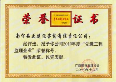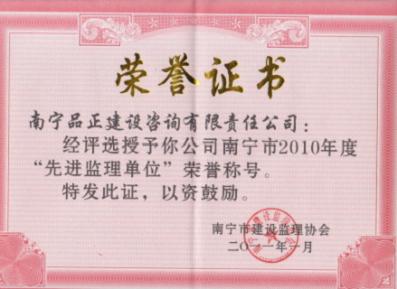 2010年12月,南寧品正獲得廣西建設(shè)監(jiān)理協(xié)會(huì)、南寧市建設(shè)監(jiān)理協(xié)會(huì)分別頒發(fā)的廣西2010年度“先進(jìn)工程監(jiān)理企業(yè)”、南寧市2010年度“先進(jìn)監(jiān)理單位” 榮譽(yù)稱號(hào)。公司總工程師陳秋獲得廣西“優(yōu)秀總監(jiān)理工程師” 榮譽(yù)稱號(hào),盧天昌、萬立名獲得廣西“優(yōu)秀監(jiān)理工程師”榮譽(yù)稱號(hào)。陳秋、張學(xué)群、曾振華、馮人杰、萬立名獲得南寧市“優(yōu)秀總監(jiān)理工程師”榮譽(yù)稱號(hào)。姚思清、黃燕玲、賴建華、李風(fēng)雷、盧天昌獲得南寧市“優(yōu)秀監(jiān)理工程師”稱號(hào)。
